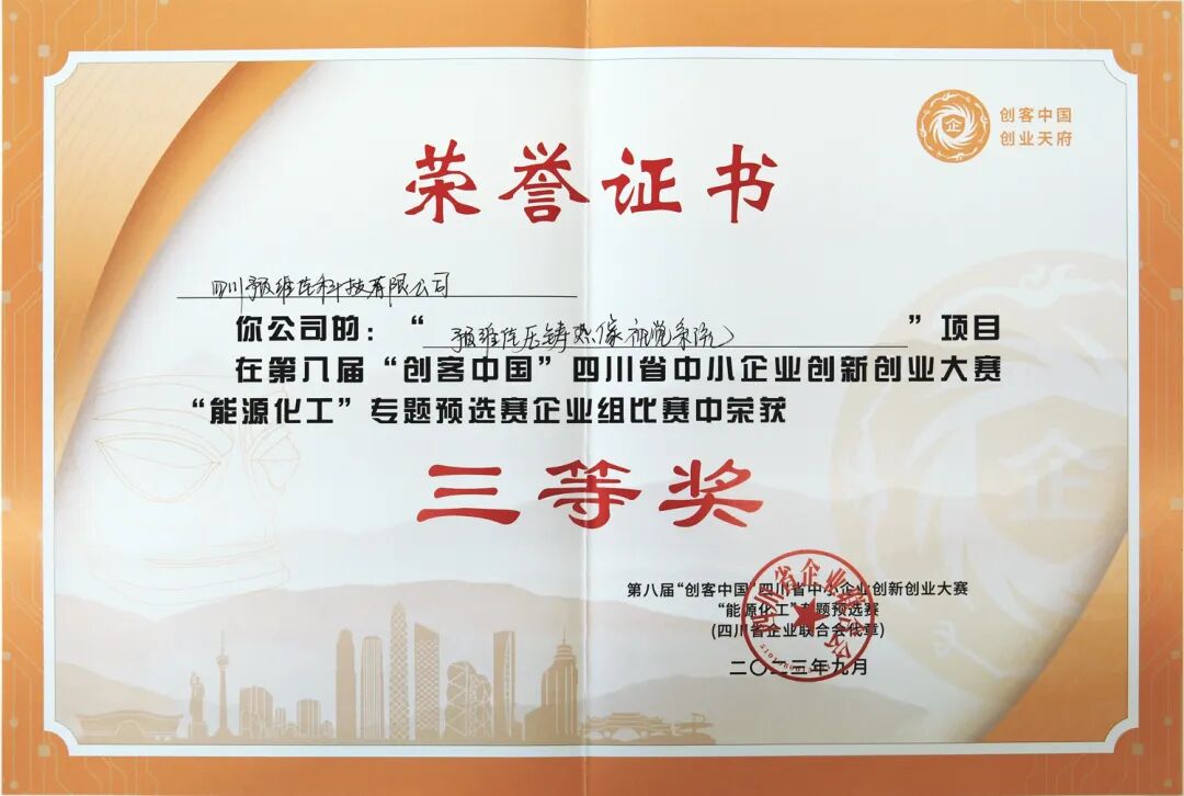 预维佳科技凭借其创新的压铸热像视觉系统(U-DTVS)在第八届“创客中国”四川省中小企业创新创业大赛“能源化工”专题预选赛荣获三等奖。